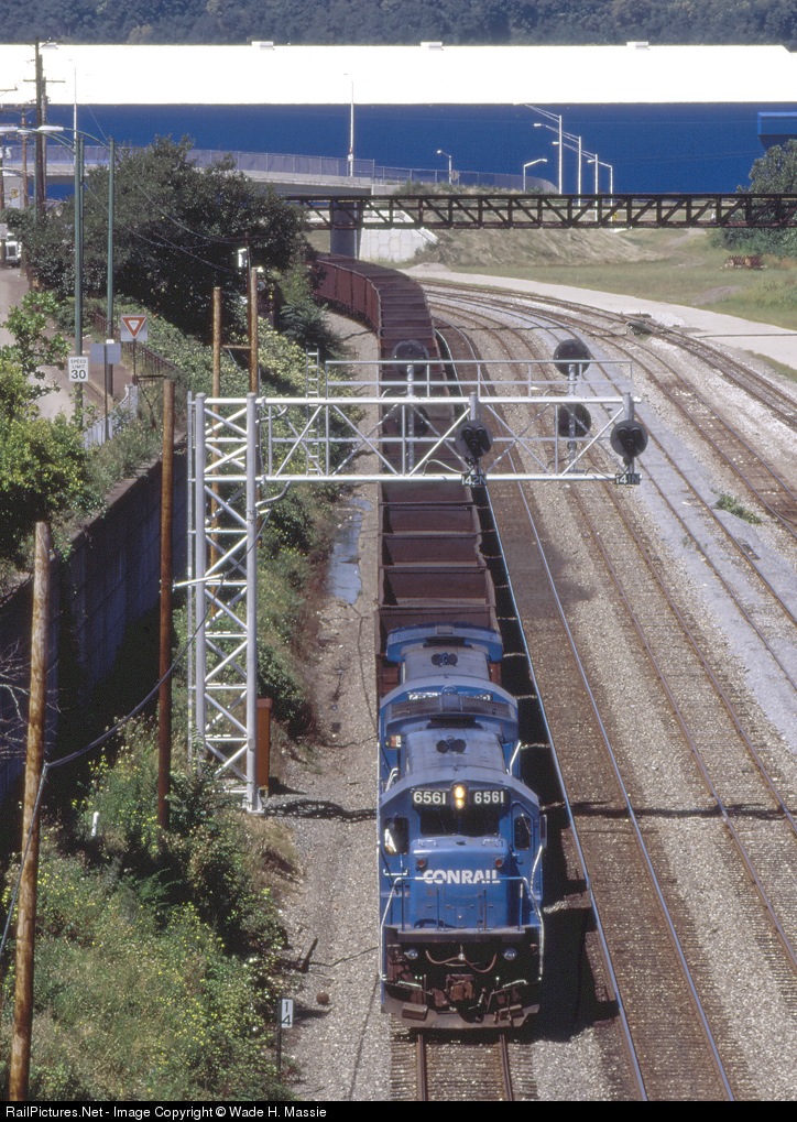 | In the heart of the Steel Valley, an empty hopper train rolls past recently installed NYC style signals at MP 14. |