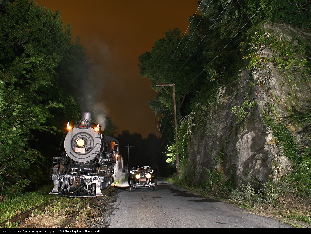 Belvidere & Delaware 142 and a local motorist take part in a late night drag race as they squeeze between the rock outcropping and the Delaware River. Thanks to Steve Barry and Fred Jones for providing the lighting.
