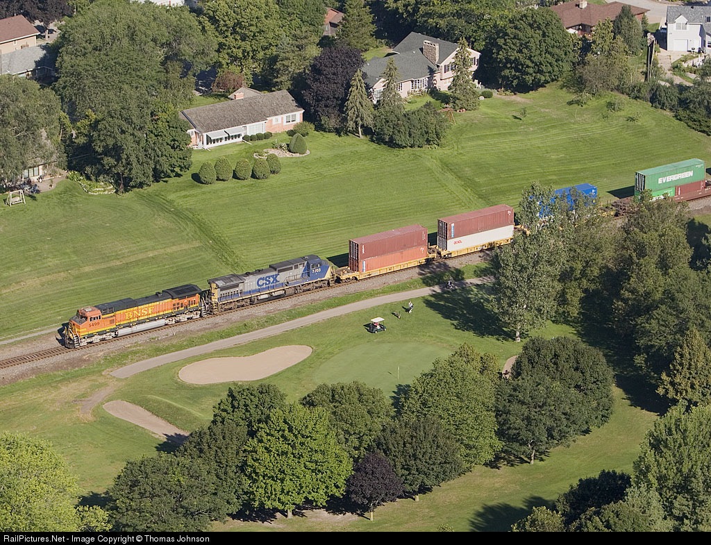 Intermodal Stack Train from Tacoma, WA (Blair) - Chicago, IL (Cicero Yard) rolls east past the Forest Hills Country Club on a beautiful mid-August morning.