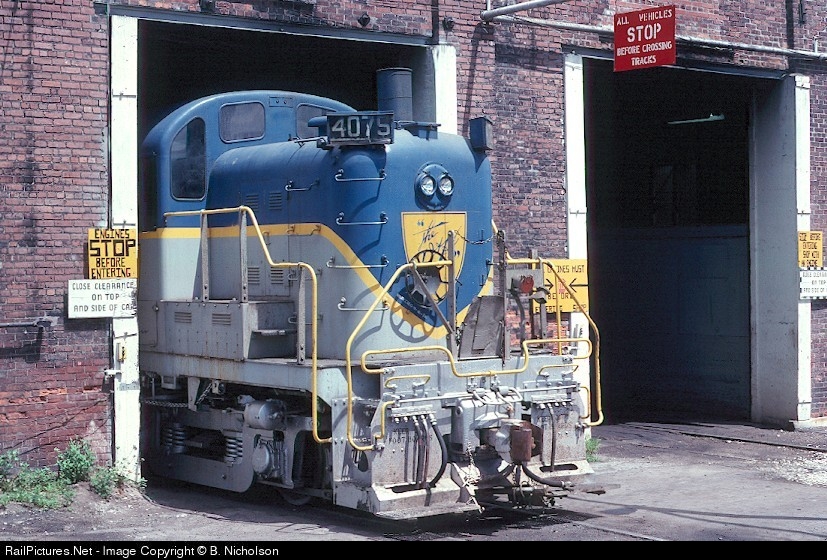 | D & H 4075 peeks out of the Whitehall diesel shop. This unit was originally a Boston & Maine unit which the D & H traded for to get the Steam generator as backup power for the Adirondack. |