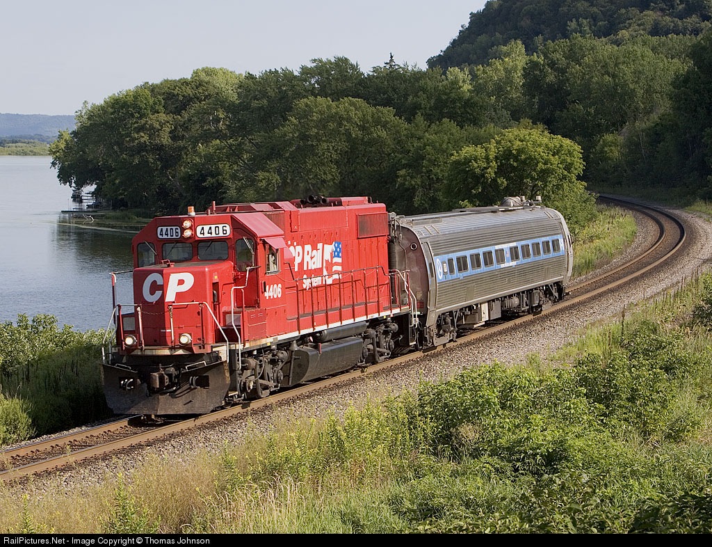 | After wying the train at River Junction, CP 4406 and FRA test car T-16 head north along the Mississippi River towards Winona, MN. |