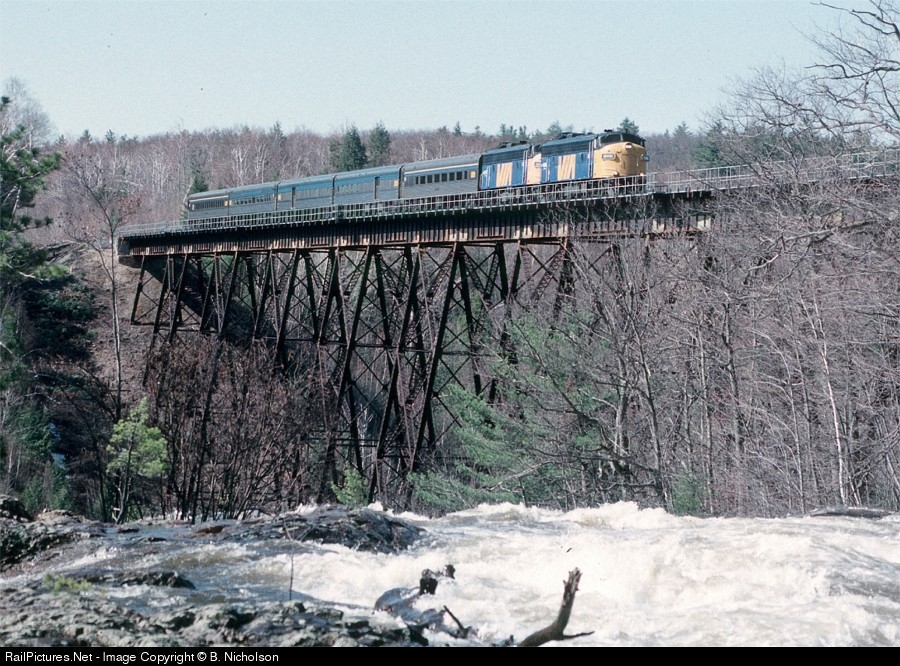 A pair of Via FP9u's heads the train to Jonquiere/Senneterre over the spectacular bridge at St Ursule; a provincial park. The spring runoff makes for torrent of water under the bridge.
