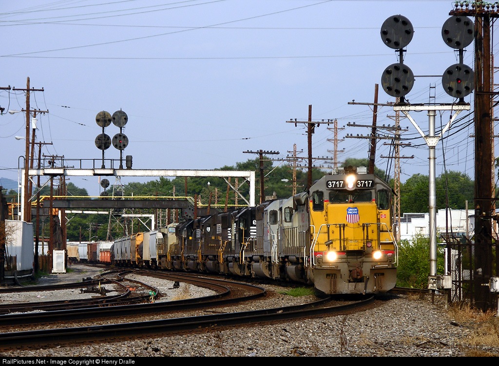 | NS 128, with a UP unit leading 2 NREX units and 5 NS units, slows to a crawl at the NS East End Shops in downtown Roanoke. |