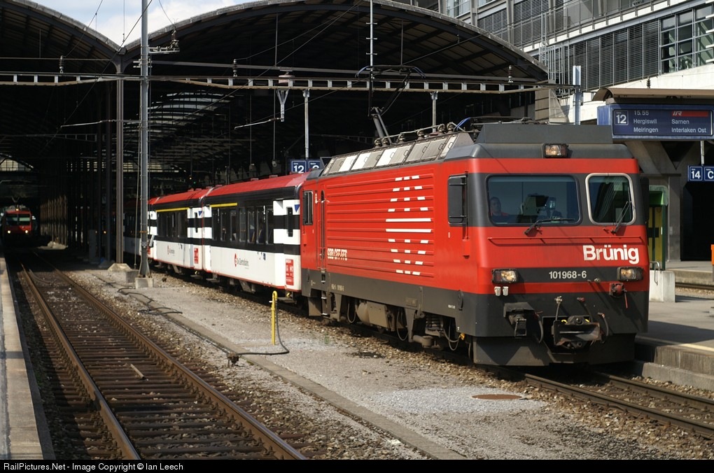 | 101 968,still in the old SBB Brunig livery,departs Lucerne with the 15.55 to Interlaken Ost. |