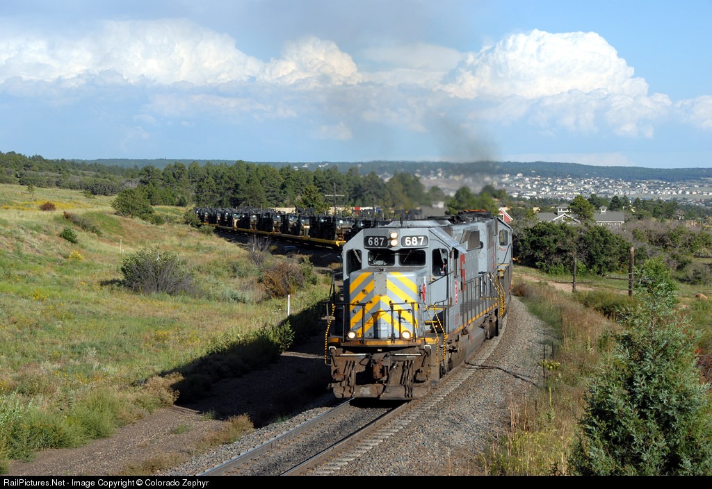| Storm front cleared Palmer Lake in time for BNSF northbound unit military train of 52-cars. KCS 687, KCS 7015 & BNSF 6313 had Army Heavy Expanded Mobility Tactical Trucks (like model M977) aboard flatcars behind the power. |