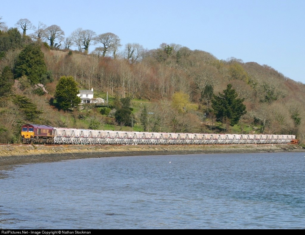66002 passes Golant with a loaded china clay train from Goonbarrow to Fowey Docks.