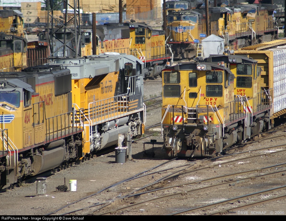 Two former SP switchers work in the yard next to the Rio Grande heritage unit, UP 1989.
