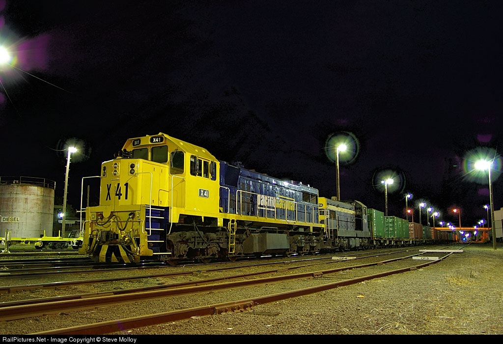 | X41 and preserved T356, which is on hire due to loco shortages, rest in Bendigo yard. on a Deniliquin container train. |