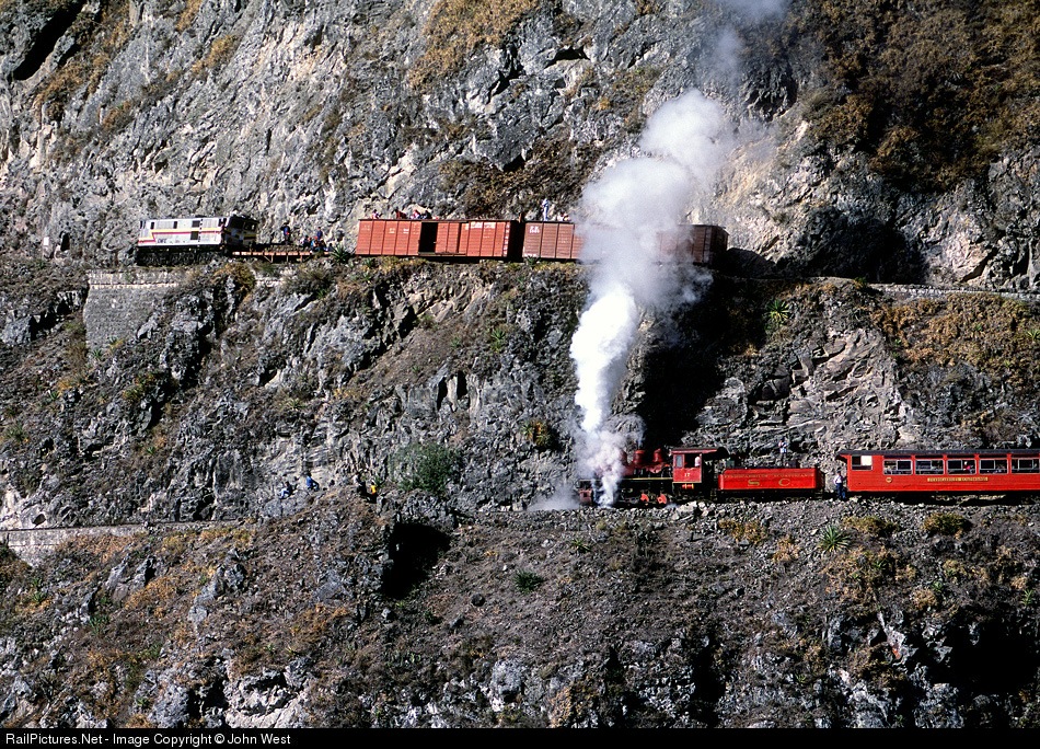 Trains Unlimited tour on the G&Q. Only parts of the railroad are open, but this includes the spectacular Devils Nose. No. 17 is lettered for the Sibambe Cuenca, an abandoned G&Q branch. The diesel is French built.