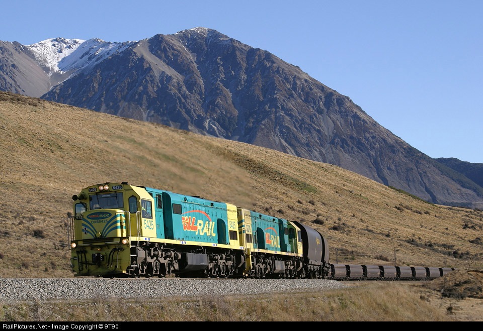 Trains on 3' 6" (1.067m) track from Whangarei to Bluff with virtually heritage rebuilt EMD and GE locomotives still the mainstay power. The network was privatized in 1990's and operated by Toll until 2008 when state owned KiwiRail was established.