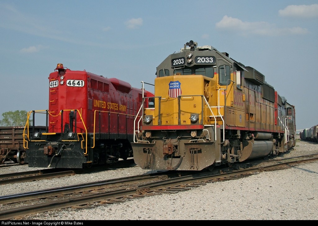 UP 2033 was switching cars while US Army 4641 (in excellent condition) looks on.