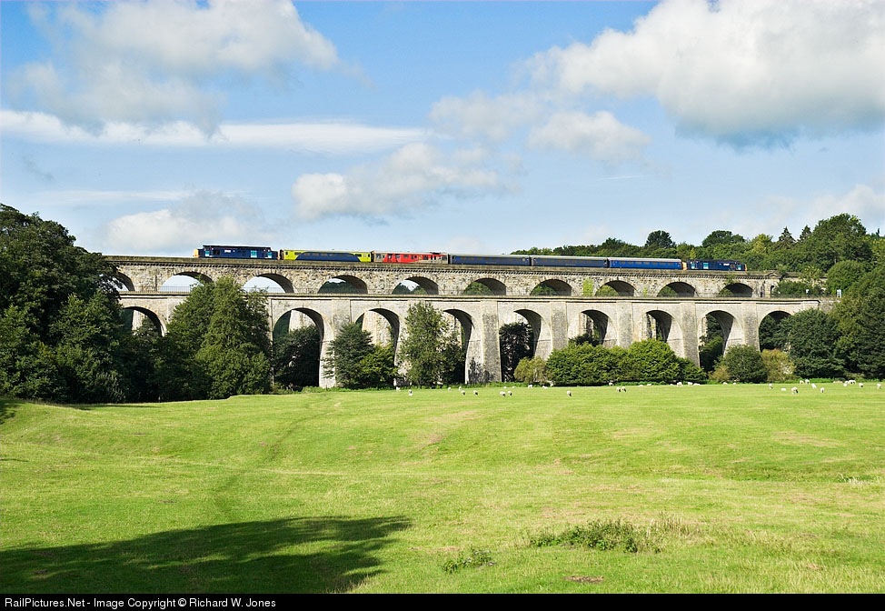 With the Chirk aqueduct in front, 37611 with 37607 powering on the rear cross the River Ceiriog and also from Wales into England over the Chirk viaduct on the 1Z14 08.53 Crewe Heritage Centre to Wrexham Central Serco test train, en-route to Shrewsbury.