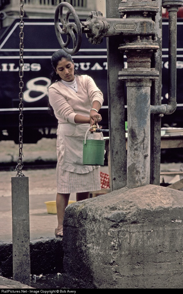 A local lady collects water for domestic use from the railroads water coloumn. Baldwin 2-6-0 #45 simmers behind.