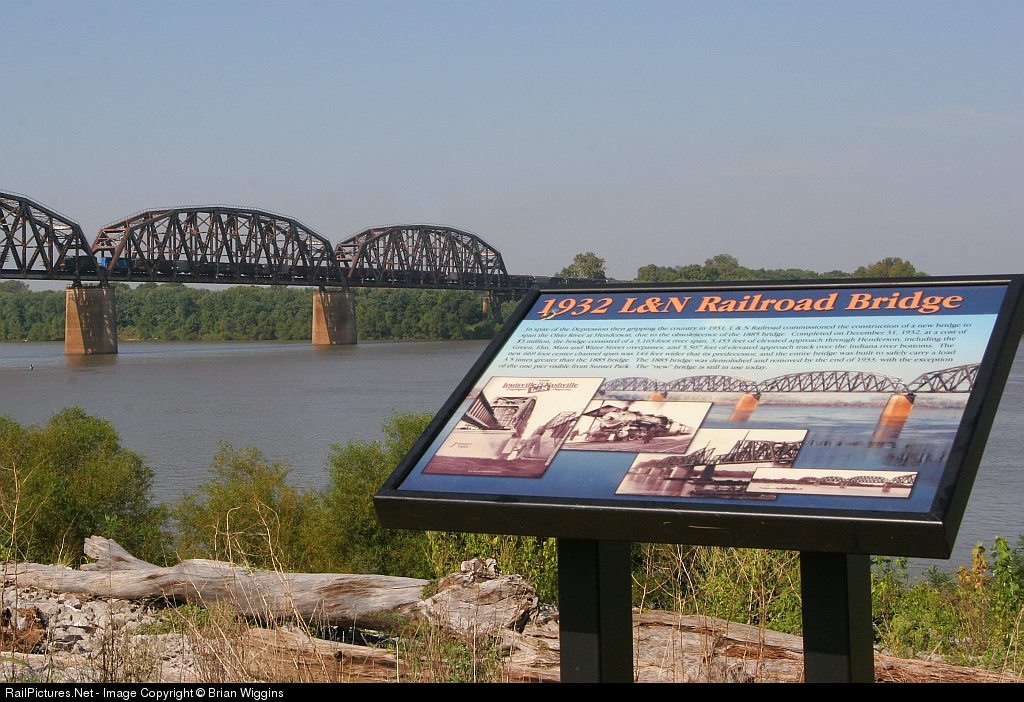 A placard that explains construction of the 1932 L&N bridge and SB train Q265 crossing over the river.