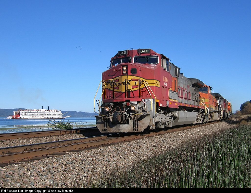 BNSF 640 rolls down river wrong main as the Mississippi Queen rolls up river for a stop in La Crosse.