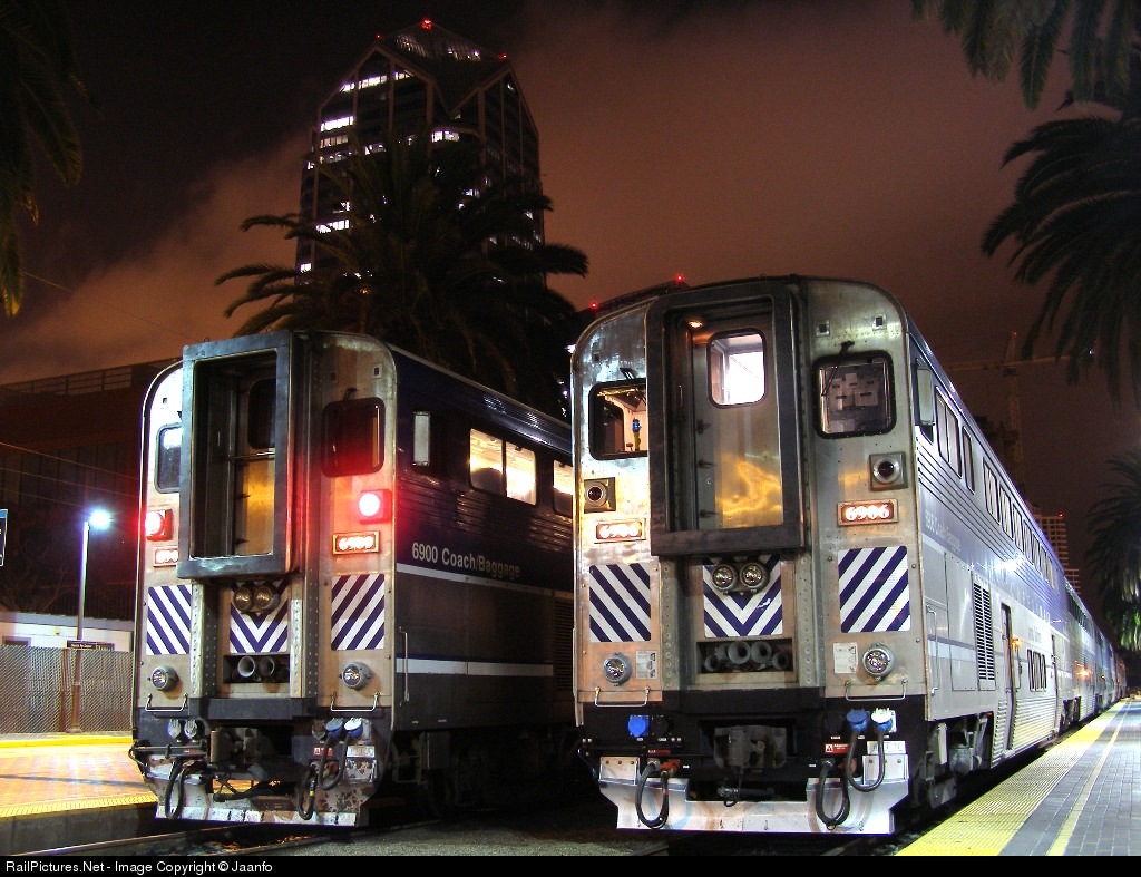 | I couldn't resist this shot... On its first day back in service after hitting a Semi, a clean 6906 was ironically tied down next to 6900 in San Diego. 6900 was the first stupid-driver casualty for the surfliners, and spent three years in rebuild for it |