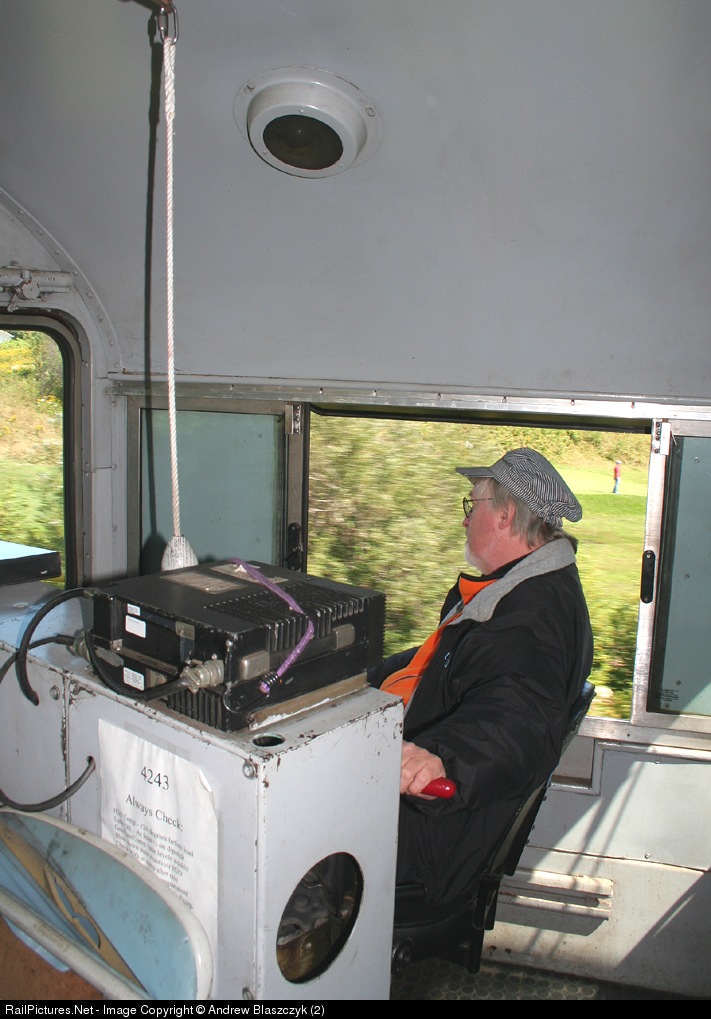 | Engineer and operations manager, Bill Borkowski focuses on the tracks ahead of him. The cord in the middle of the photo is for a whistle that is used in the towns instead of the horn. |