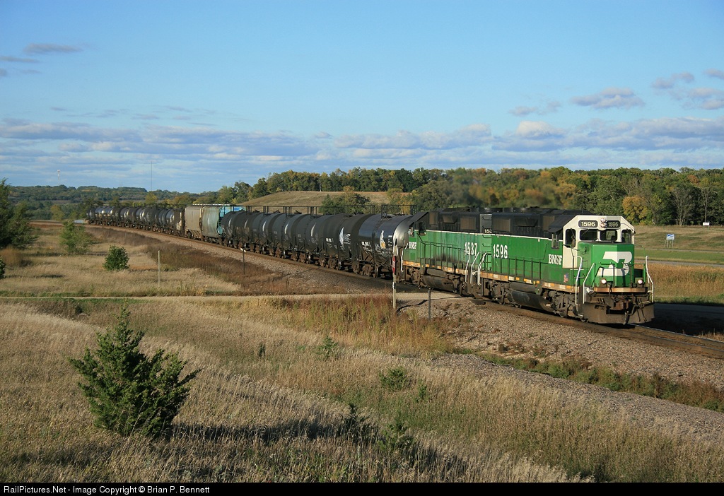 The Marshall local climbs out of the Minnesota River valley, dashing for Marshall to clear up for a parade of northbounds behind two GP28 rebuilds with neat histories: -28P 1596 and -28M 1537 (ex-BN, nee-BN GP9s 1961, '66; CB&Q 276, 281, respectively.)