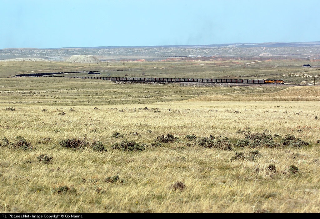 | UP full coal descends Logan Hill. Behind upper right is a deadhead of BN fashon two SD70Ms ascending toward coal mine area. In the distance there is remaining smoke of blasting at Antelope coal mine. |