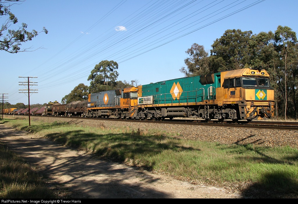 NR53 in Trailerail livery and NR82 leading a south bound PN steel train out of Bargo