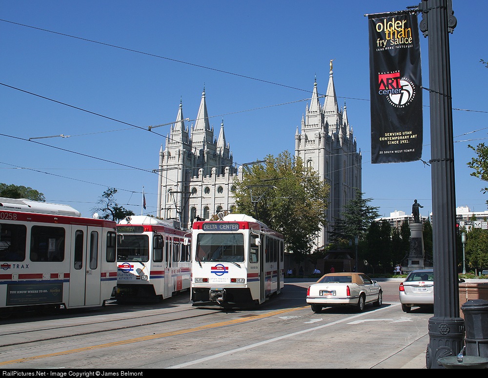 A pair of UTA TRAX LRV's meet at South Temple and Main Streets in downtown Salt Lake City. The distinctive Salt Lake Temple was completed in 1893, requiring 40 years to build.