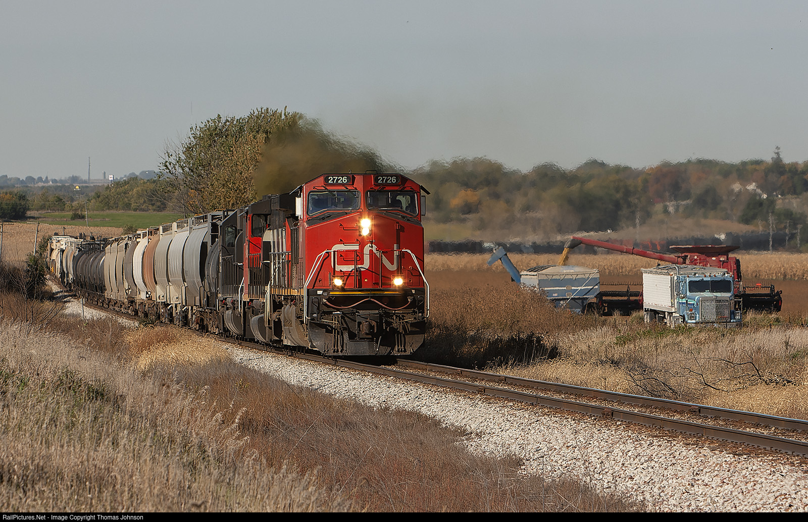 Freight Train from Waterloo, IA - Chicago, IL circles around a farmer dumping soybeans from his combine on a beautiful October morning.