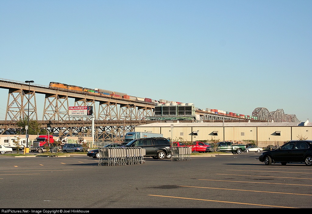 The Huey P. Long Bridge looms over the Metairie Wal-Mart parking lot, as two UP trains inch by each other. From the other end: