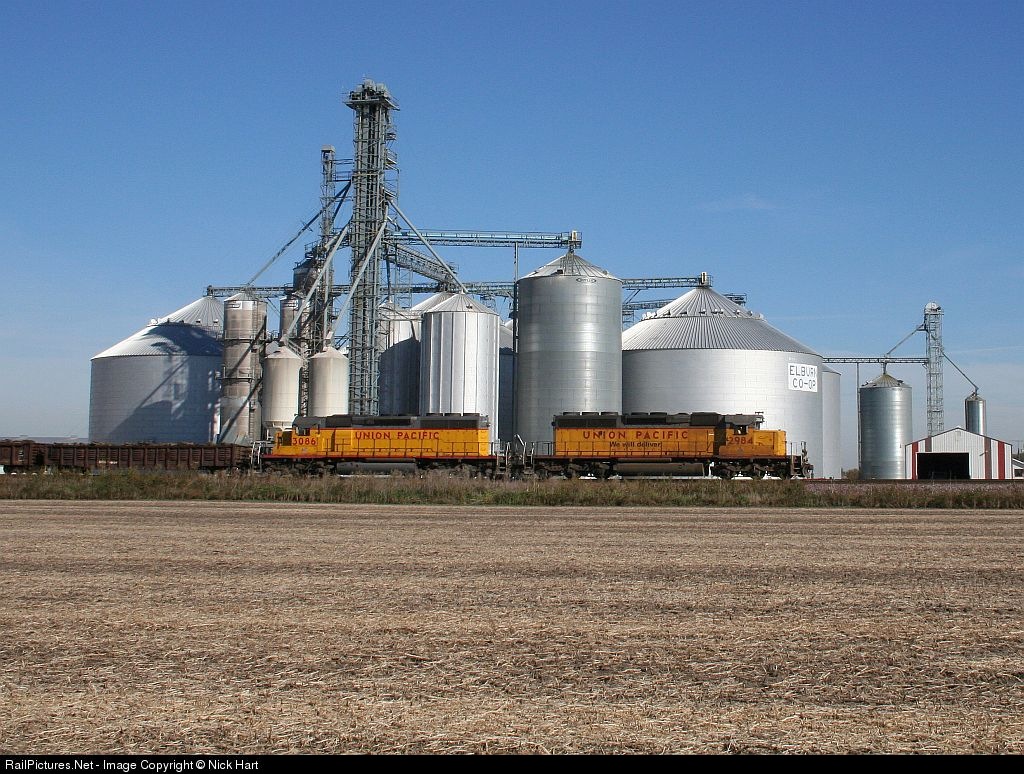 | UP SD40-2's 2984 and 3086 pass the Elburn CO-OP, with an eastbound manifest, headed to Proviso. |
