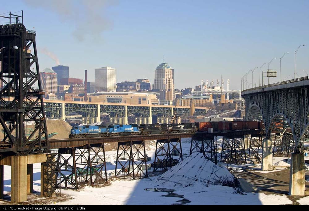 A westbound mixed bag is about to cross the Cuyahoga River on the ex-NKP mainline now known as NS's Buffalo Line.