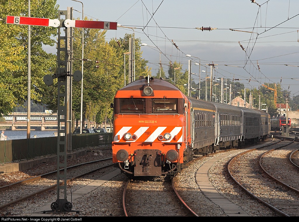 1935 arrives at Coimbra "City" station with the empty coaches for PTG Tours' special charter train. Note the typical Portuguese signals.