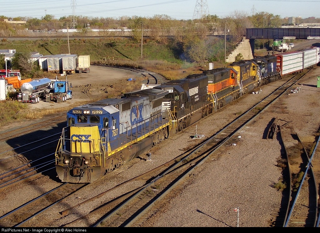 | A CSX Dash 8 leads a rainbow East out of Northtown. One SD60, two SD40-2s, and an ex CB&Q SD40 trail. |