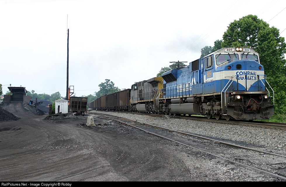 CSX 809 still sports her Conrail paint as she leads a mty hopper train north on the KY. The coal loadout to the left is the only active site left on the mainline.