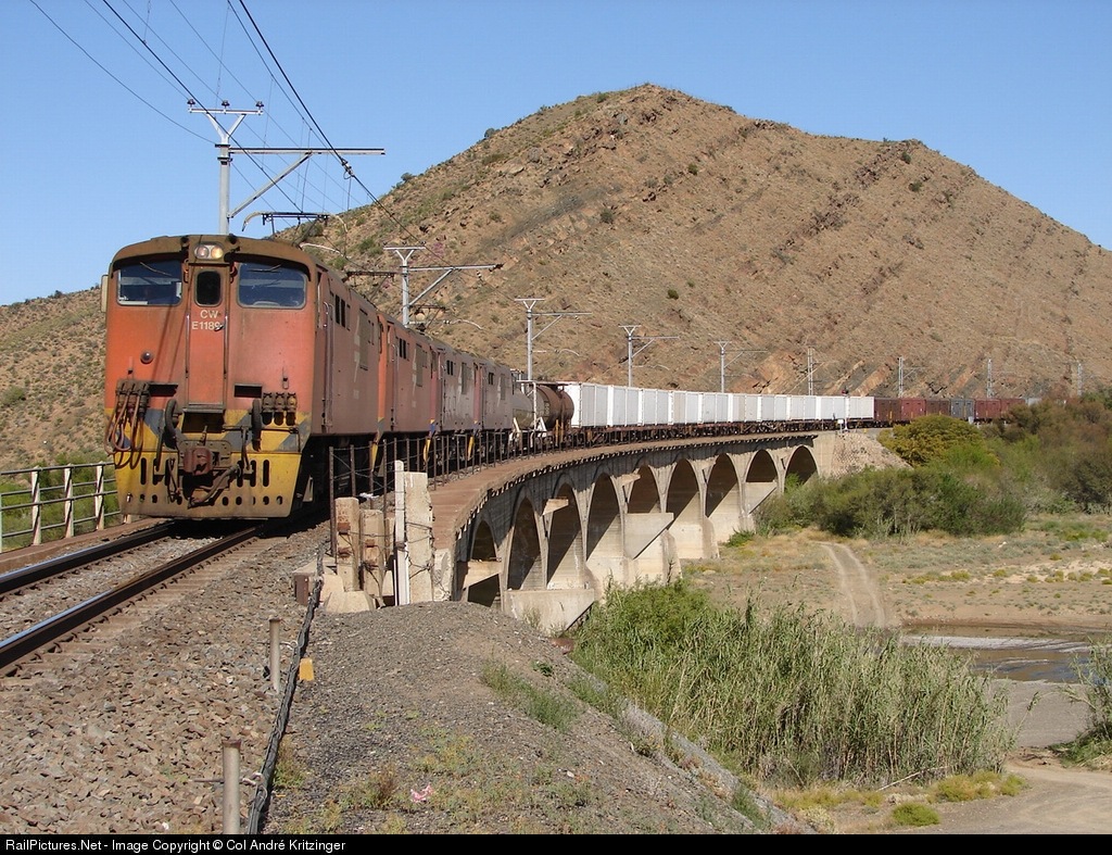 | Two Class 6E's and two 6E1's, the fourth unit dead in tow, enter Laingsburg across the Buffels River Bridge with a mixed goods train. |