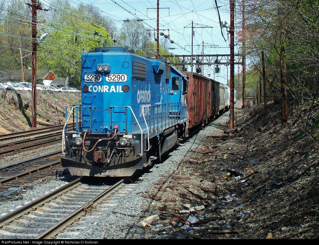 | ME18 heading west on Track 1 en route back to Metuchen Yard. The engine was built for Penn Central as PC 8090 before going to Conrail as CR 8090. In the 1990s, it was painted into a special Operation Lifesaver scheme which it retained until the Fall of 2011 when it was painted into NS black. In April of 2020, NS removed the locomotive from their roster when it was sold to Progress Rail. |