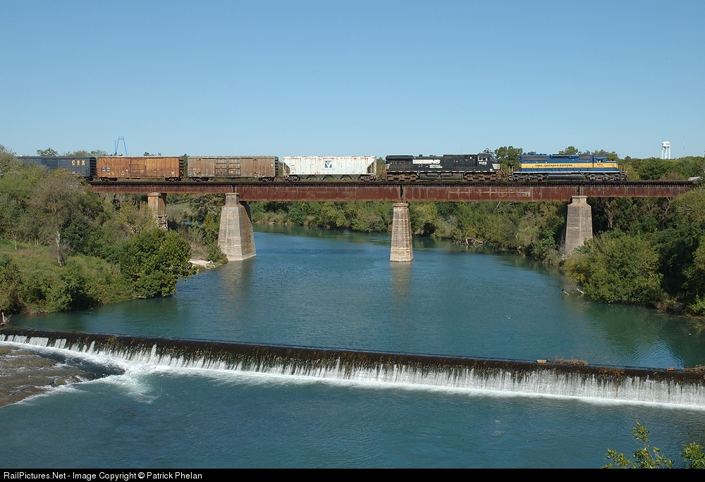 A NB mixed freight on the ex-MP between San Antonio and Austin, TX crosses the Guadalupe River in New Braufels, TX with a rare-to-these-parts ICE leader.