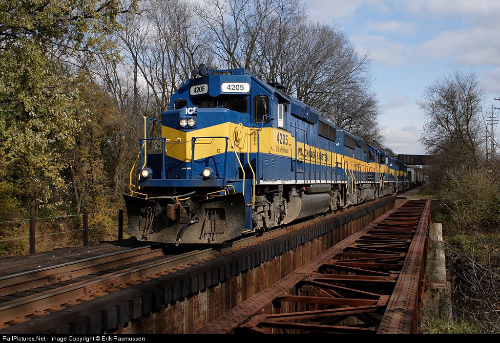 IC&E's Davis Turn ducks under CN's ex-CCP Iowa Division and crosses the Kishwaukee River with a dead westbound freight in tow. This used to be the double track mainline of the Milwaukee Road.
