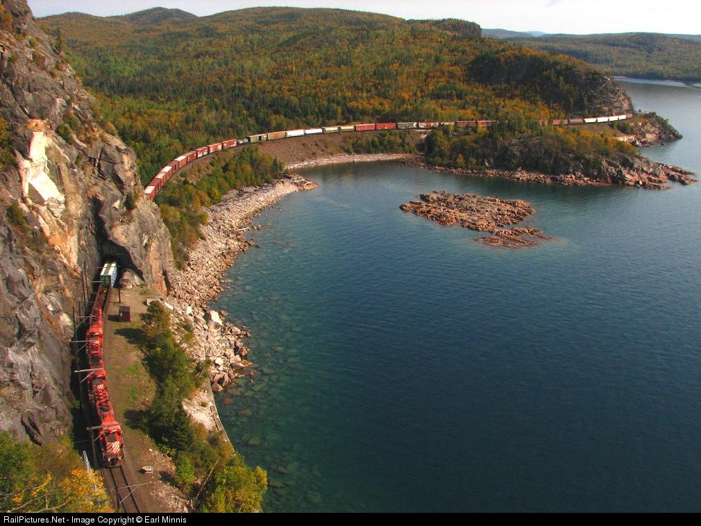 Wrapping around Lake Superior's Mink Harbour, CP 5982 WEST exits the famous 110' Mink Tunnel.