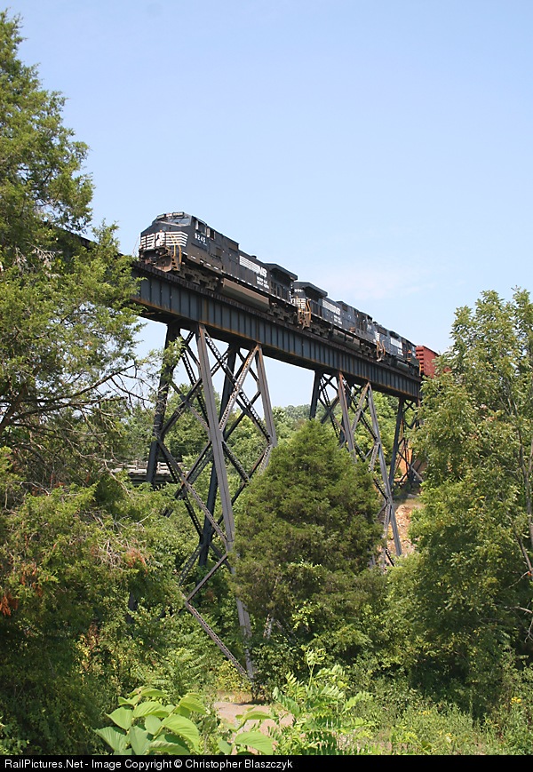 NS 9245, 9581 and 5211 soar over Overall Run on one of the many tall bridges on the scenic Shenandoah Sub.