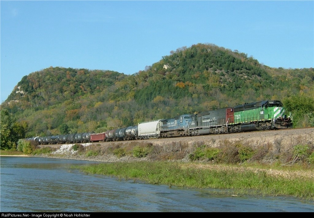 An odd consist, for this part of the country at least, leads this manifest freight past the river bluff at Victory, Wisconsin, with just a little bit of color in the hills. The ex-SP tunnel motor was especially interesting, but really the whole consist wa