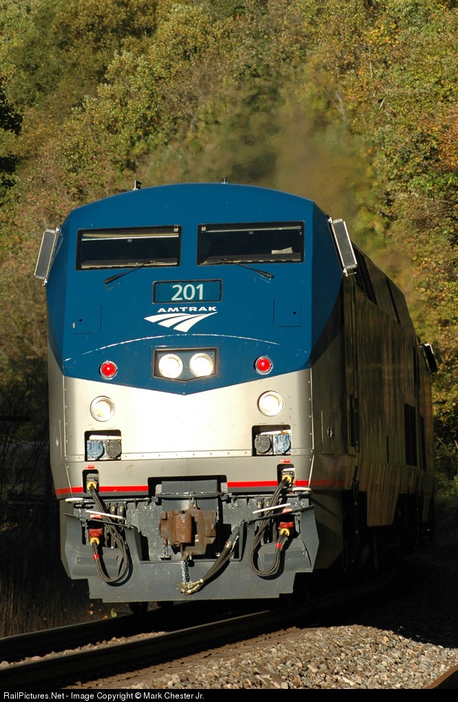 | Amtrak 201 pops out of the shadows as it leads the New River special through a curve near Montgomery, WV. |