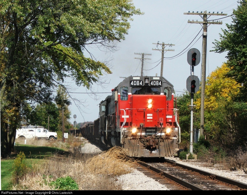 IORY 4084 leads leased CEFX 9400 on the daily southbound road frieght past a former DT&I signal through the quaint town of Leipsic, OH.