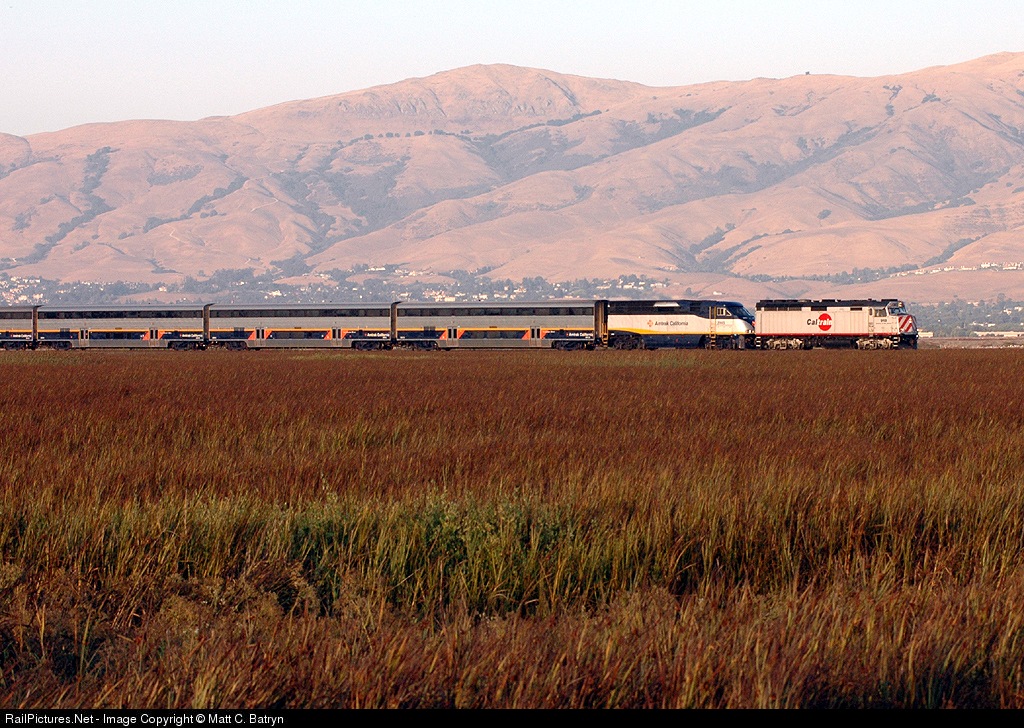 | Cal Train 918 Leads the Capitol Corridor south towards San Jose through some of the salt marshes at the bottom of the San Francisco Bay. Nikon D70, 75-300mm. |