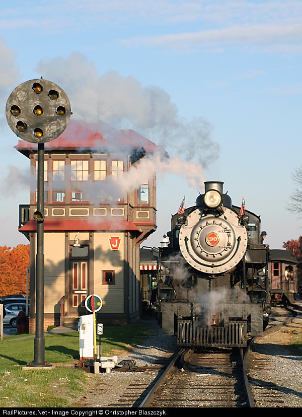 | After bringing the last train of the day into the station, 2-10-0 90 backs past an ex-PRR signal and tower on its way back to the enginehouse to be put away for the night. |