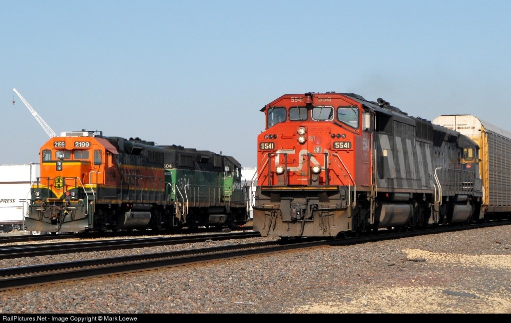 CN 5541 heads east on the BNSF Aurora Sub past the BNSF 2199 & 1504 which spend their days working the locals and yard duty.