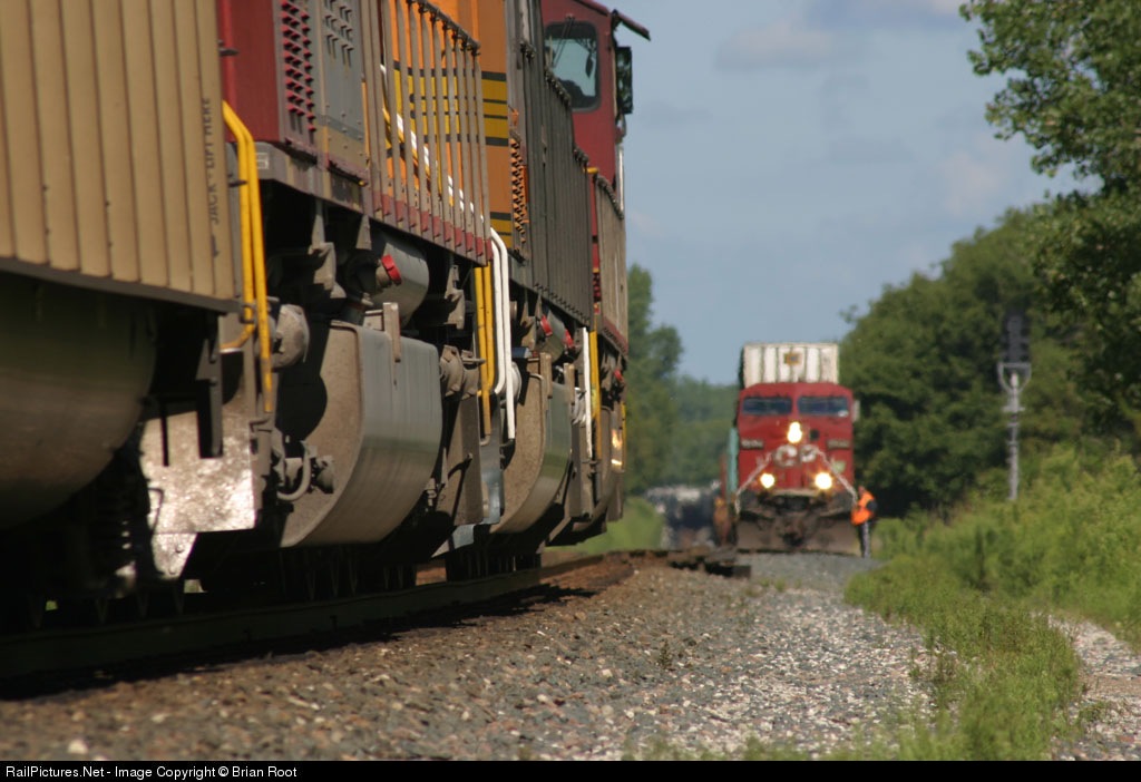 An eastbound CP train waits in the siding at Midland for a westbound BNSF coal empty to blast by.