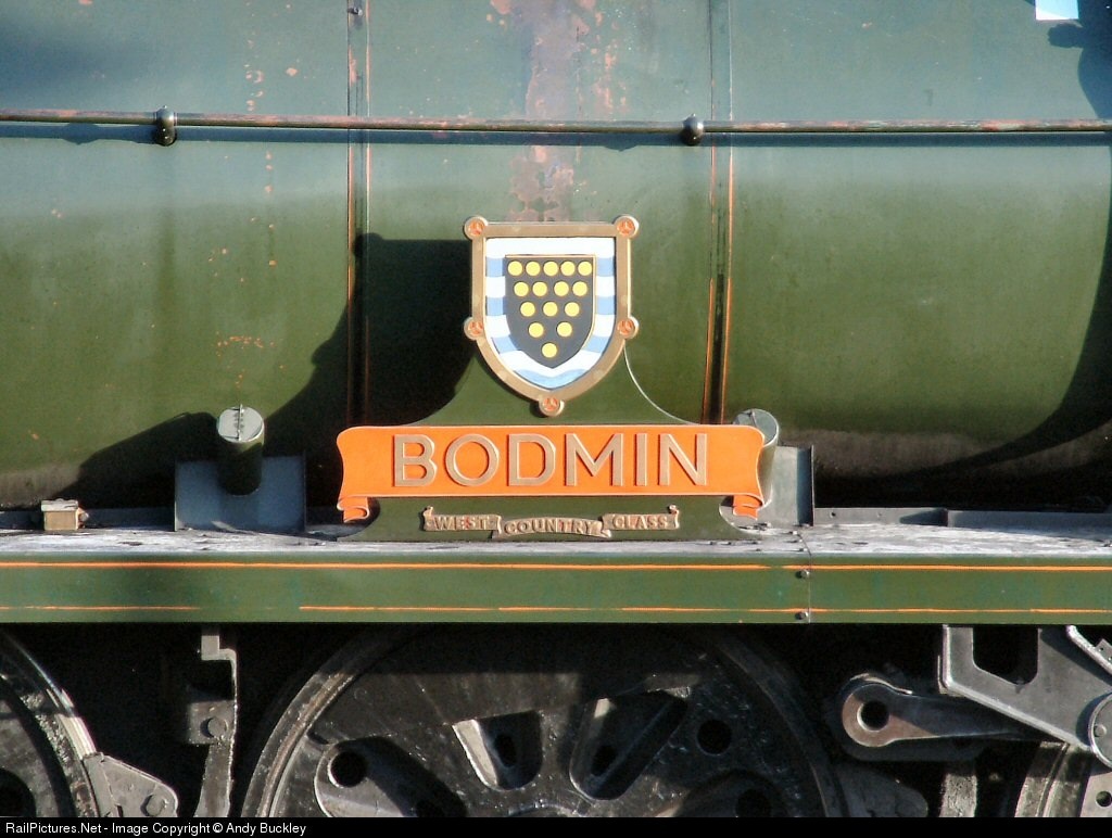 Nameplate and crest of former Southern Railway West Country class 4-6-2 No 34016 'Bodmin'. These 'light pacifics', designed by OVS Bulleid, were named after towns and villages in the UK's West Country counties (mostly Cornwall, Devon, Dorset and Somerset)