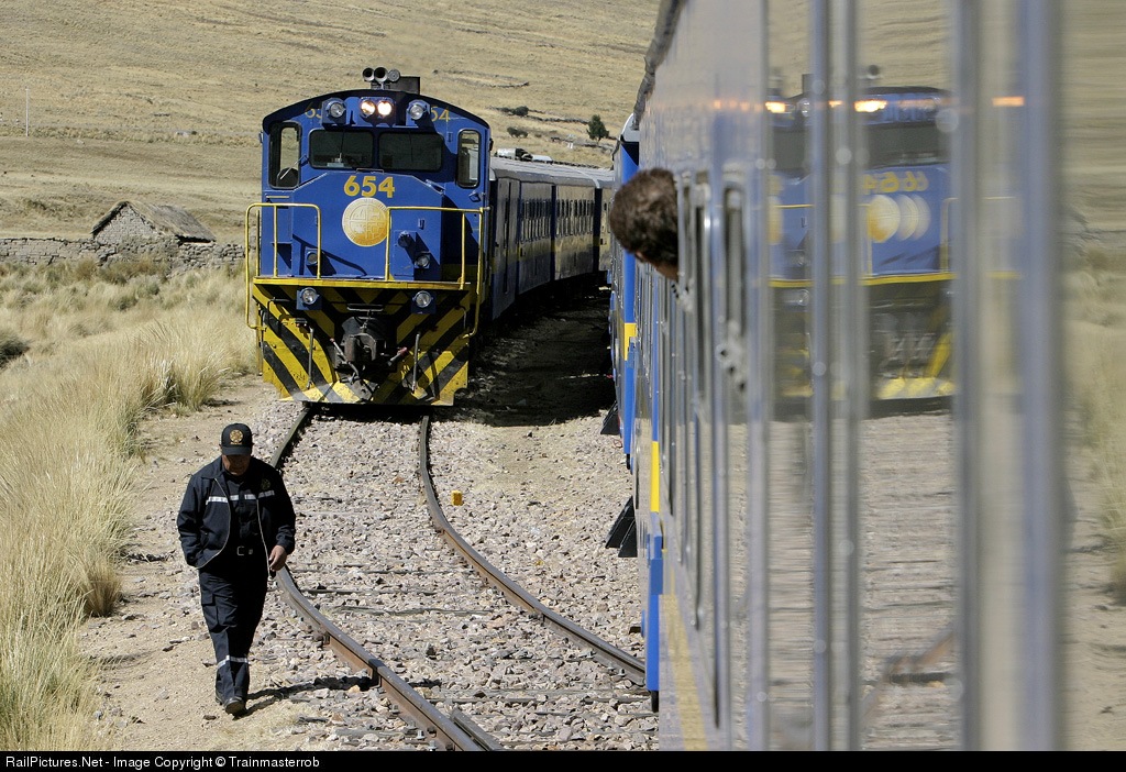 | Peru Rail 654, in charge of the Cuzco bound Andean Explorer holds the siding while the Puno bound Andean Explorer takes the main. |