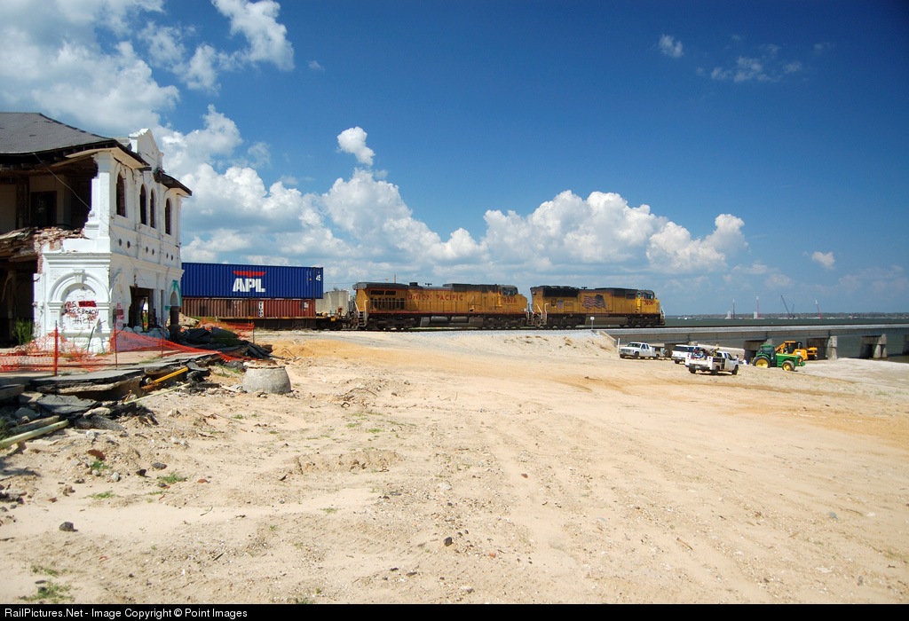 | CSXT train with UP 3806/9676 approaches rebuilt CSXT bridge at Bay St Louis. The Beach St grade crossing, the street and all buildings to the bay side are gone. With no HW bridge (backgnd), hyrail traffic on bridge is heavy. |