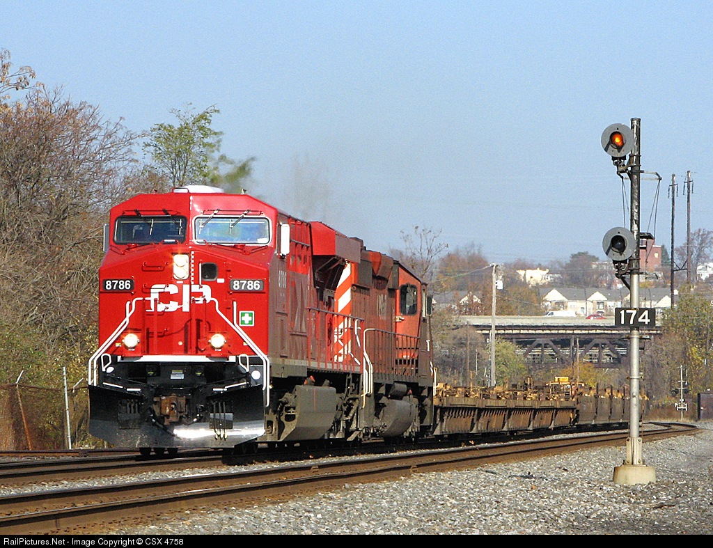 | Brand new Canadian Pacific gevo 8786 leads D&H 164 / NS 30J east on 2 track by the signal at Swedeland under sunny morning skies; train looks like a baretable up front, but there are intermodal containers and mixed freight cars to the rear. |