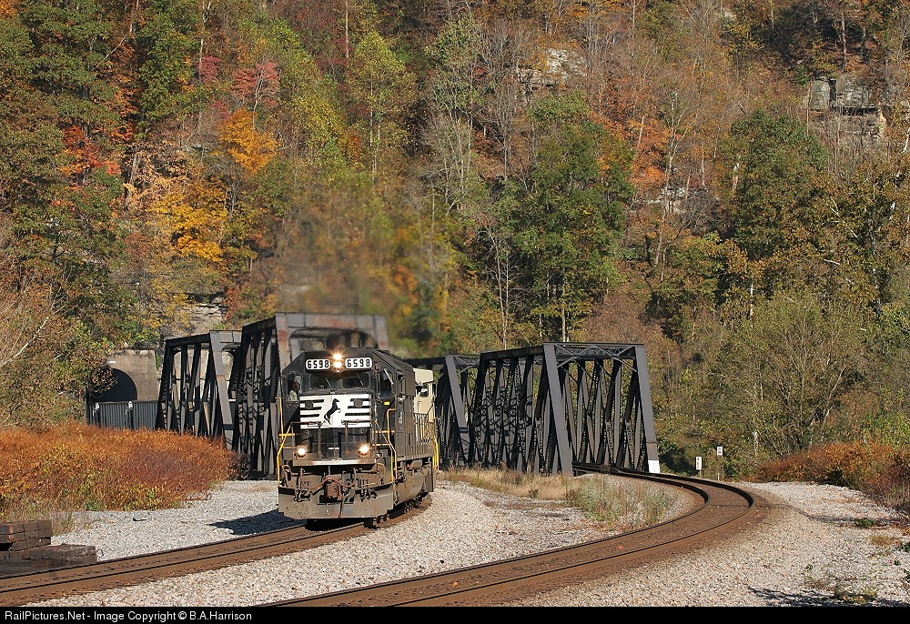 | NS 6598 and a primered unit heading east between Williamson and Matewan, WV, pulling a very long drag of coal mtys. |